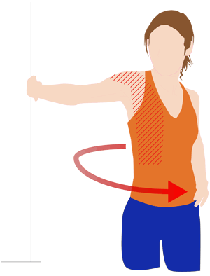 直立し、片腕を後方へ水平に伸ばす。固定物につかまり、両肩と身体を、伸ばしている腕から離れる方向に回しましょう。
